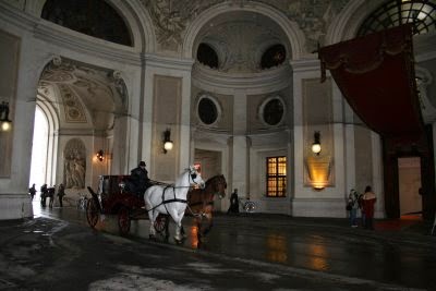 Nous sommes dans cette immense salle baroque à colonnes où eut lieu le dîner du gala de mariage de Napoléon et Marie-Louise. Nous assistons à un entraînement de dressage sur fond de musique Viennoise. Très technique.